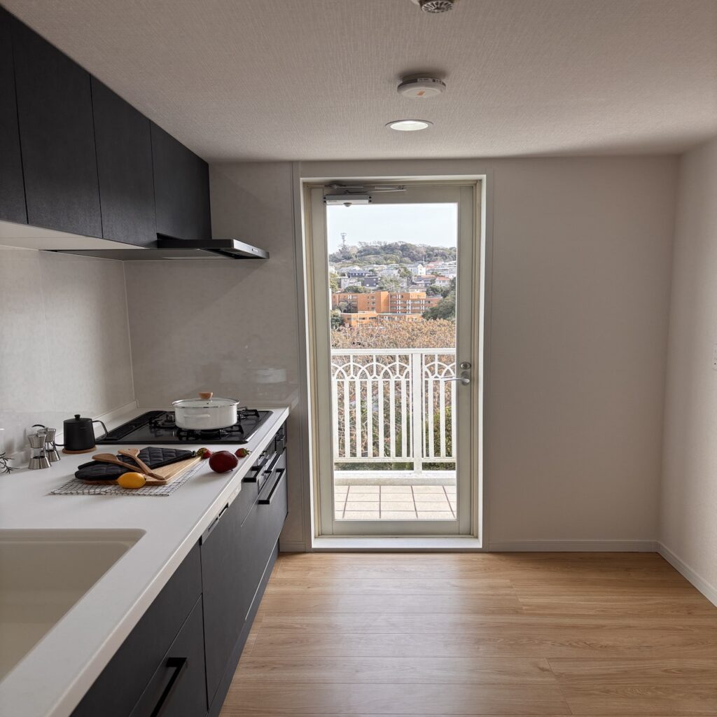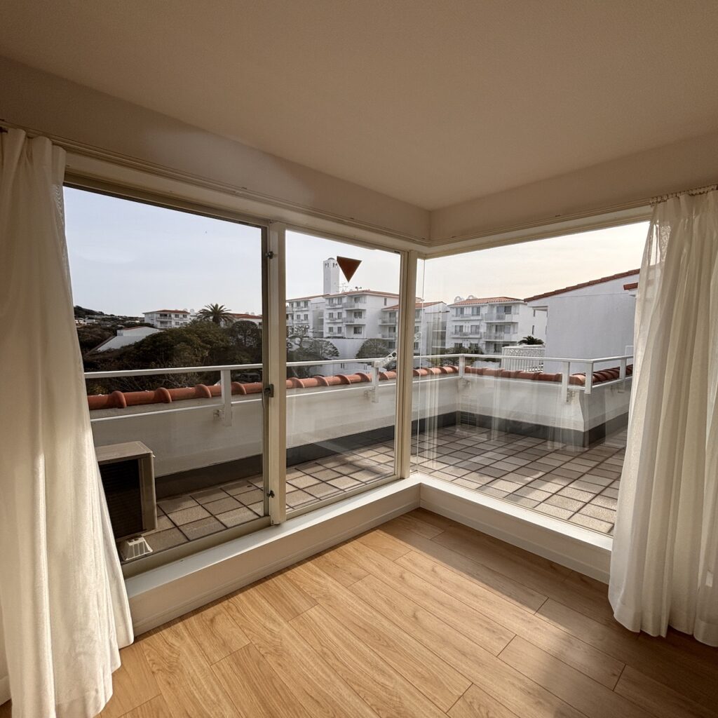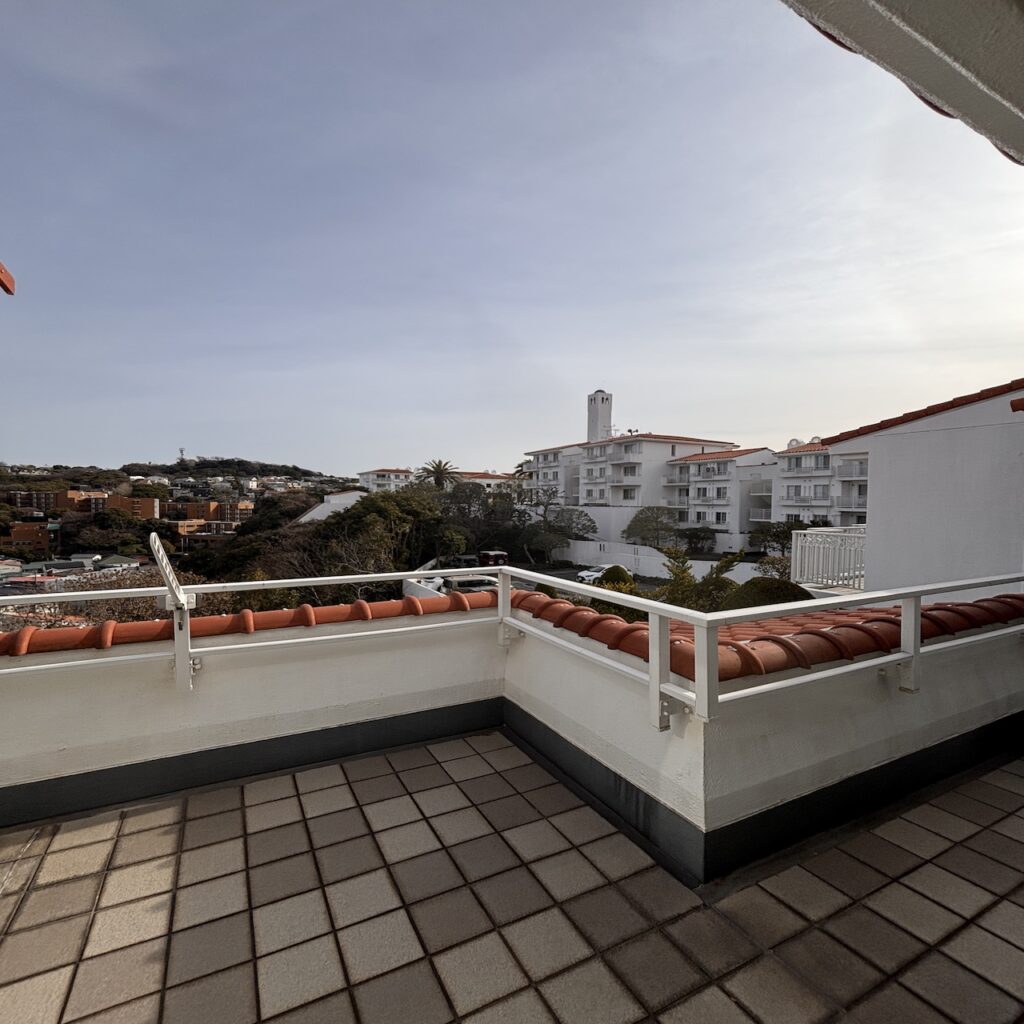 バルコニーに出ると、海こそ見えないが、材木座海岸まで徒歩圏内という距離感が妙に現実味を帯びてくる。